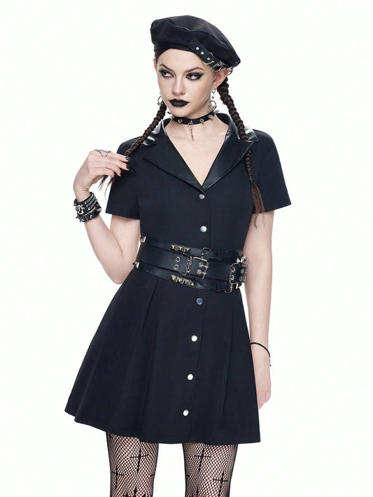 Alternative Simple Splicing Unique Collar Metal Button A-Line Fitted Dress