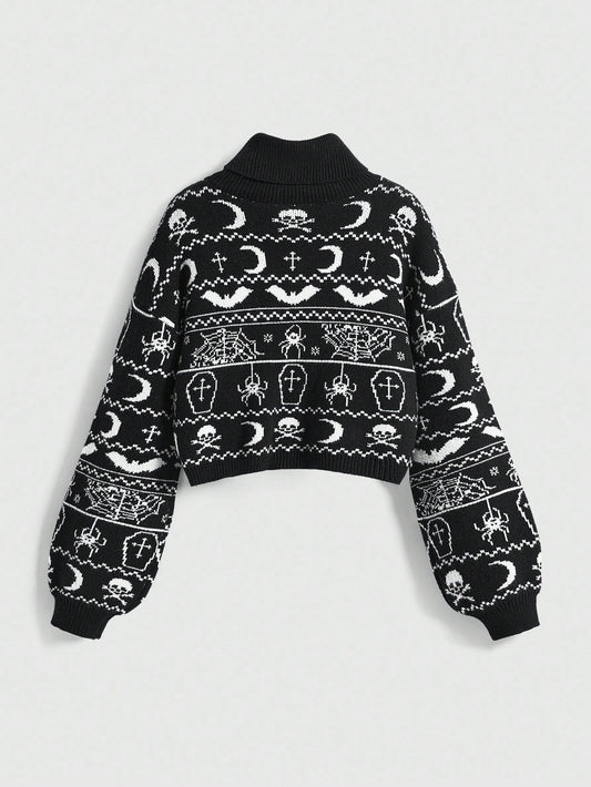 Goth Cemetery Pattern Knitted Crop Turtleneck Sweater