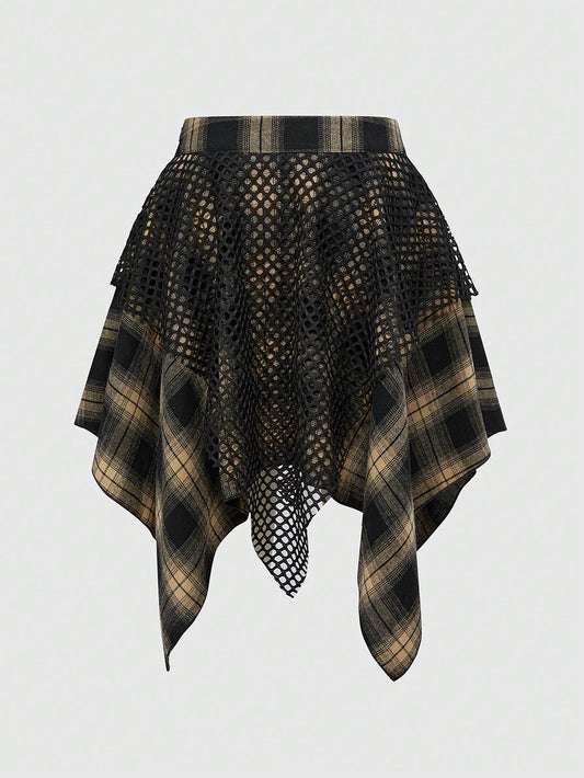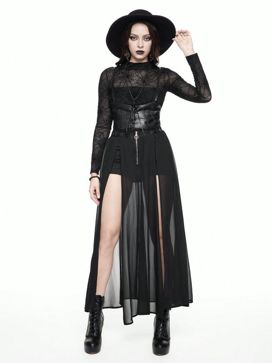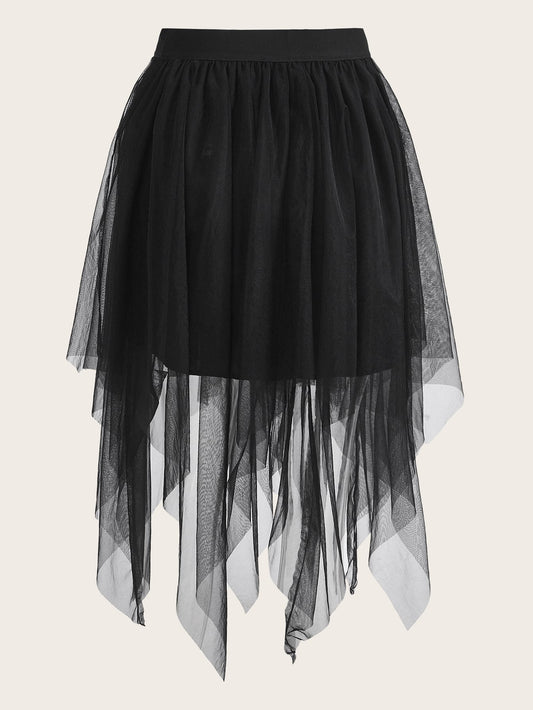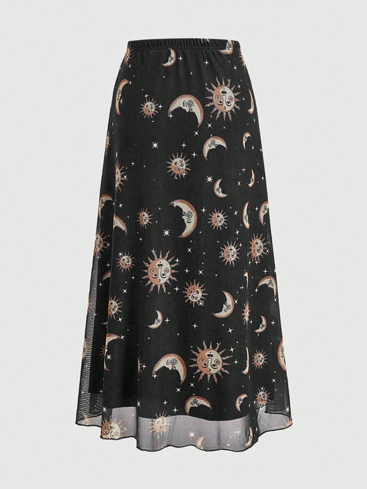 Witchy Sun & Moon Graphic Asymmetrical Hem Mesh Skirt