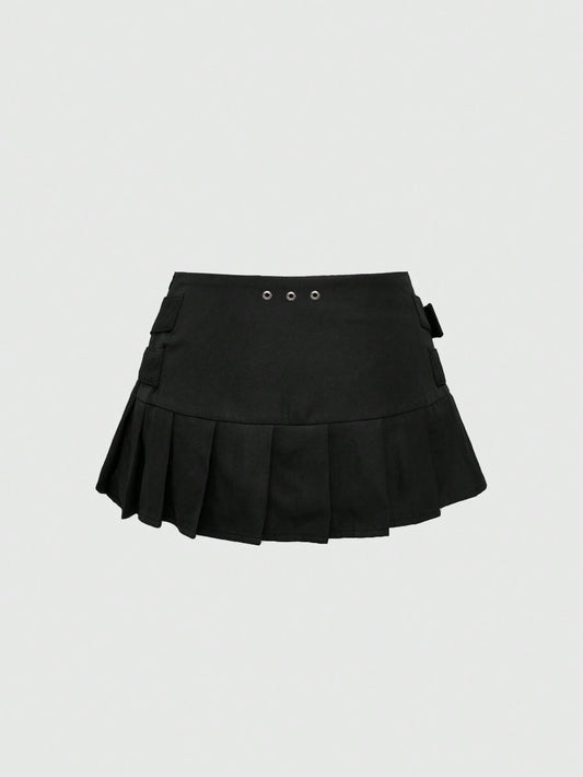 Grunge Buckle Asymmetrical Hem Pleated Skirt
