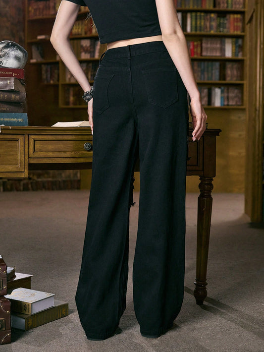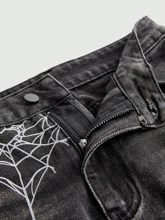 Grunge Punk Distressed Spider Print Straight Leg Boy Friend Jeans
