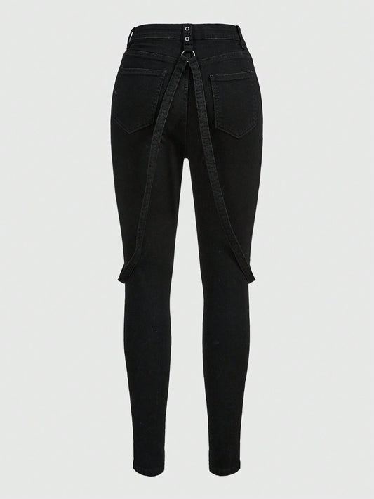 Alternative Ripped And Frayed Skinny Jeans With Suspenders