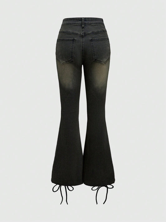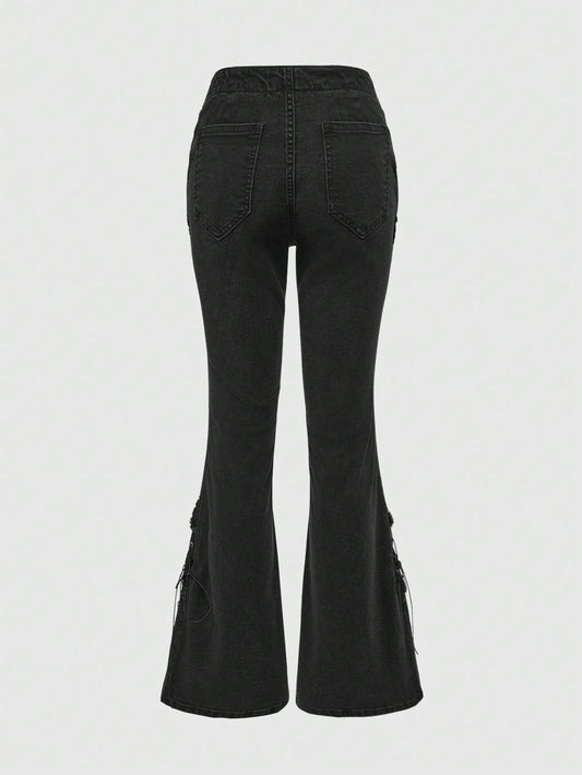 Grunge Hollow Eyelets Lace-Up Decor Ultra Low Rise Skinny Flare Jeans
