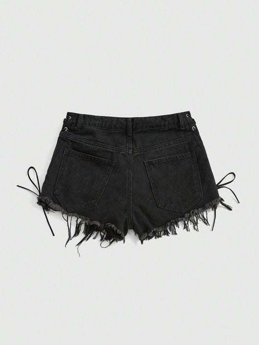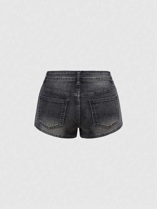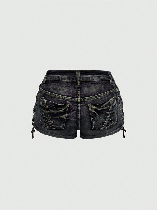 Grunge Vintage Washed Side Metal Cross Decor Low Waist Mini Shorts