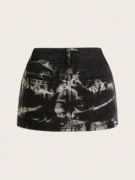 Punk Low Waist Black Tie-Dye Denim Skirt With Pockets