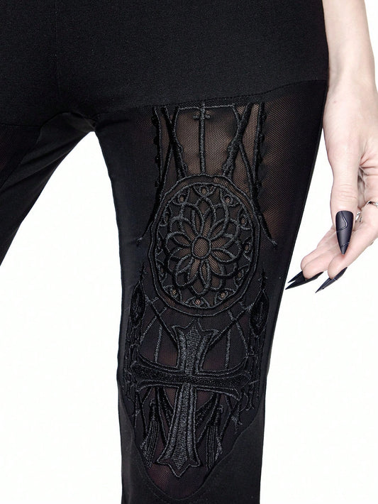 Gothic Totem Embroidery Pentagram Metal Decor Mesh Splicing Leggings