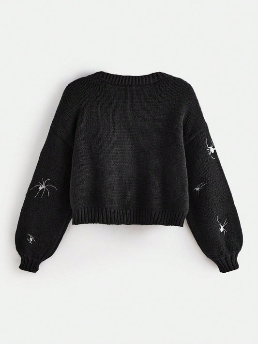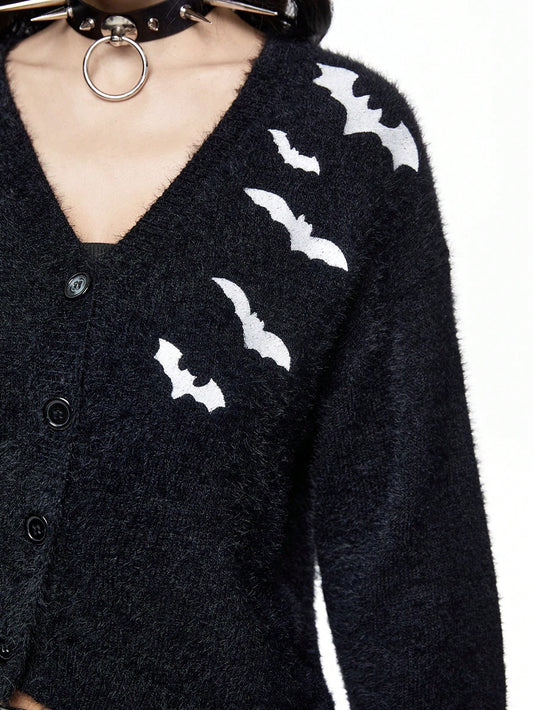 Gothic Bat Embroidered Fuzzy Cardigan Sweater