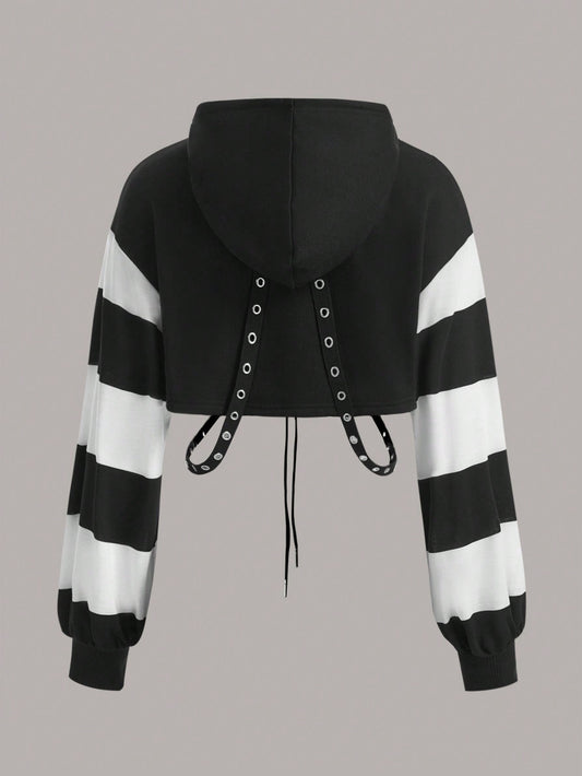 Punk Striped Sleeved Grommet Eyelet Crop Hoodie