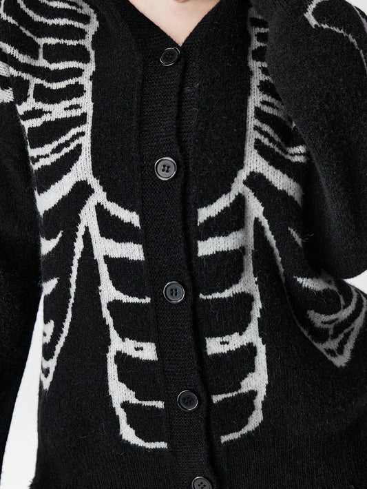 Gothic Skeleton Distressed Design Hooded Cardigan Knitted Sweater