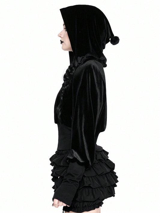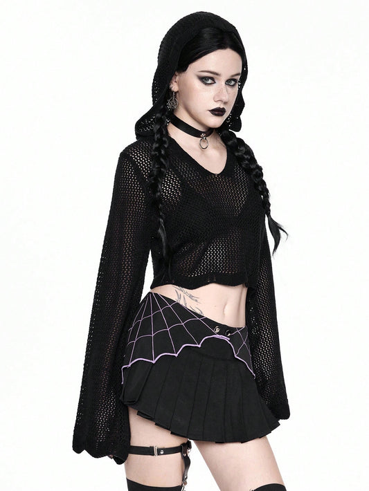 Hooded Witchy Knitted Crop Sweater With Flared Sleeves