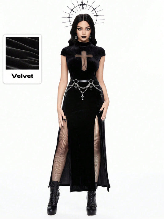 Goth Dark Vampire Cross Cutout High Slit Bodycon Dress