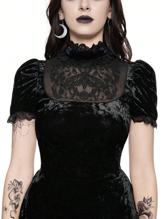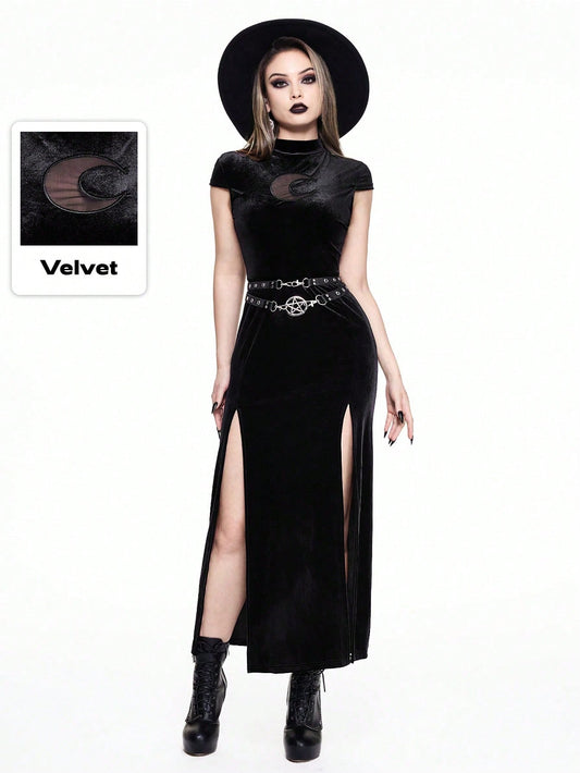 Gothic Crescent Moon Embroidery Hollow-Out High Slit Velvet Dress