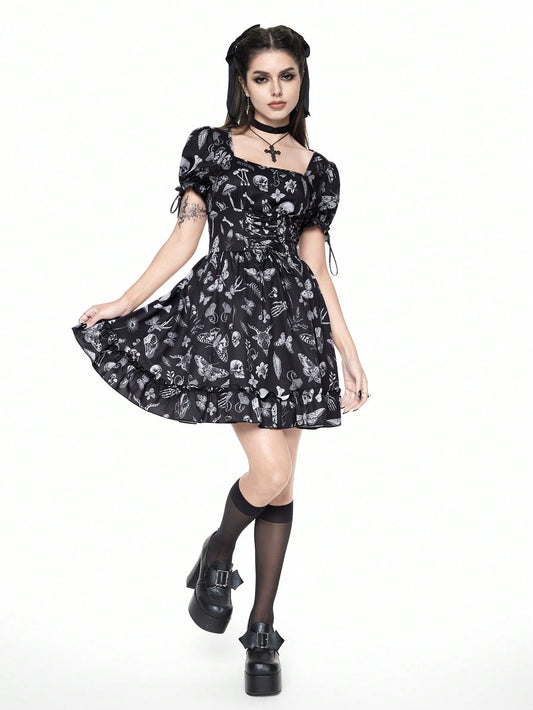 Goth Vintage Botanical Print Puff Sleeve Lolita Style Dress
