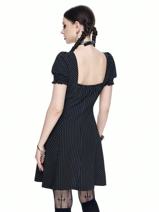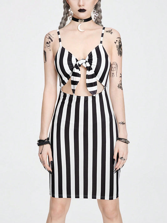 Goth Summer Casual Striped Front Zipper Mid-Length Dress