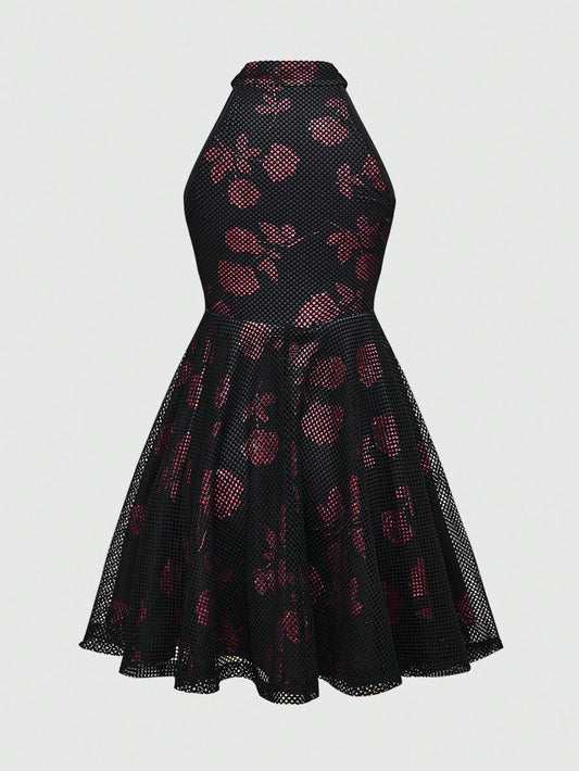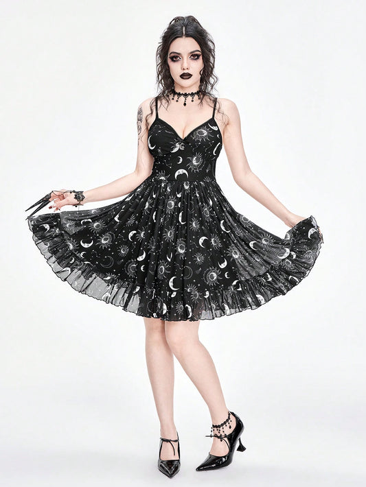 Dark Night Moon Mesh Print Ruffle Hem Cami Dress