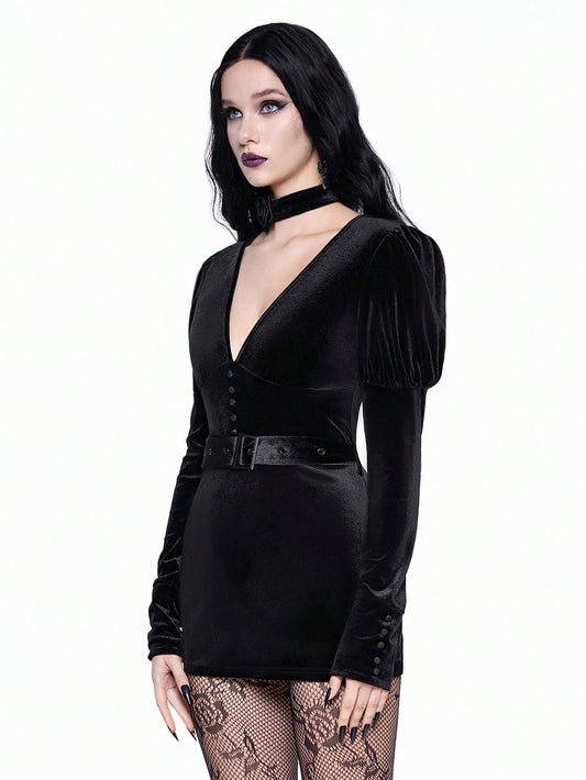 Vintage Goth V-Neck Choker Bodycon Mini Dress