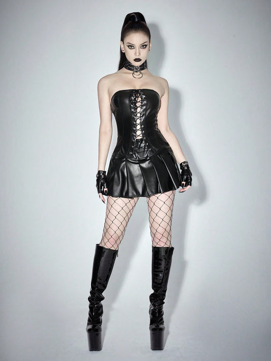 Punk Leather Mini Halter Pleated Dress