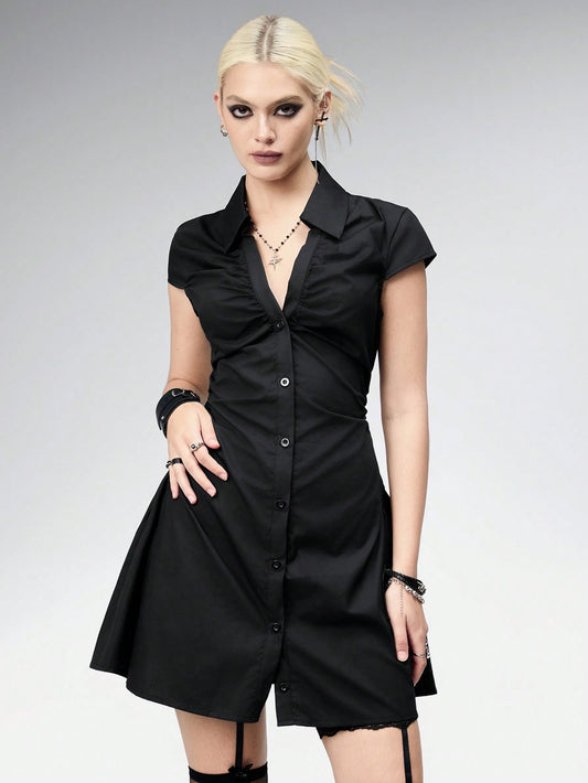 Dark V-Neck Drawstring Waist Shirt Dress