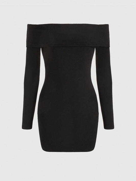 Alternative Off Shoulder Collar Solid Black Bodycon Dress