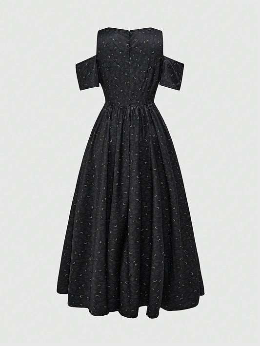 Moon & Floral Print V-Neck Off-Shoulder High Slit Maxi Dress