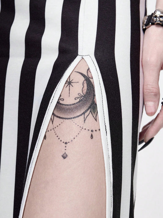 Gothic Black & White Striped High Split Maxi Dress