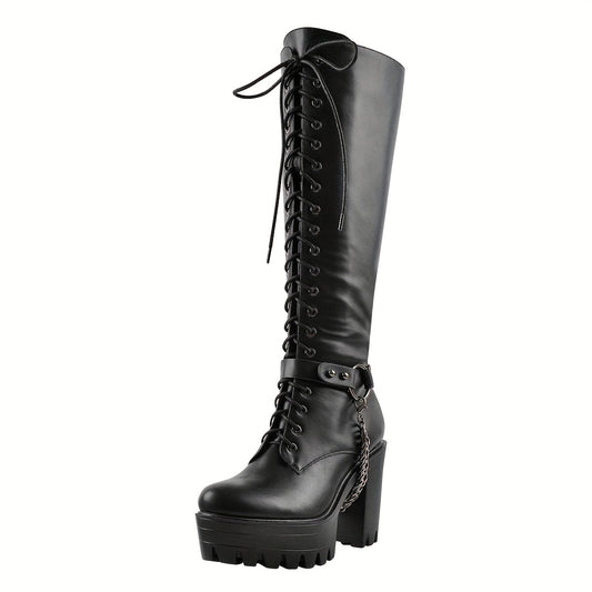 Punk Lace Up Knee High Chunky Heel Metallic Chain Decor Boots
