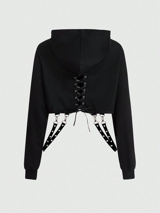 Grunge Punk Solid Lace Up Back Crop Hoodie