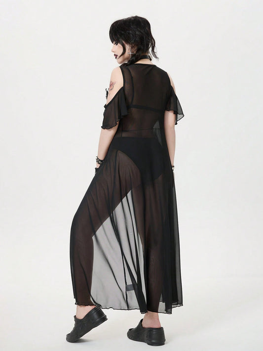 Goth Off-Shoulder Ruffle Hem Semi-Sheer Belted Cover Up