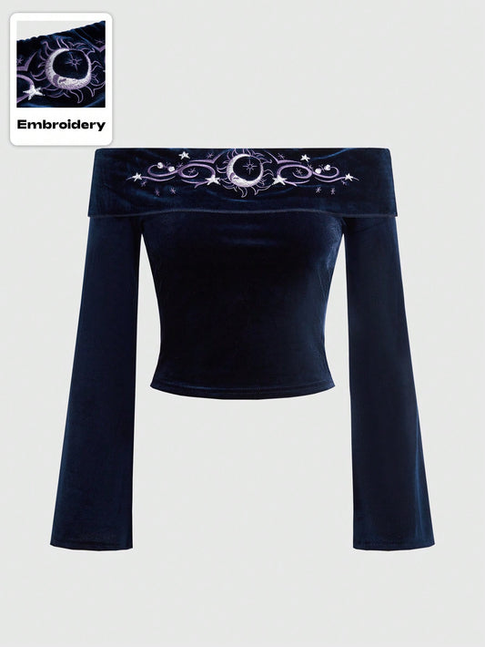Witchy Velvet Off Shoulder Embroidered Moon Top
