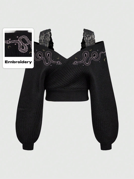 Snake Embroidery Lace Off Shoulder Pullover Sweater