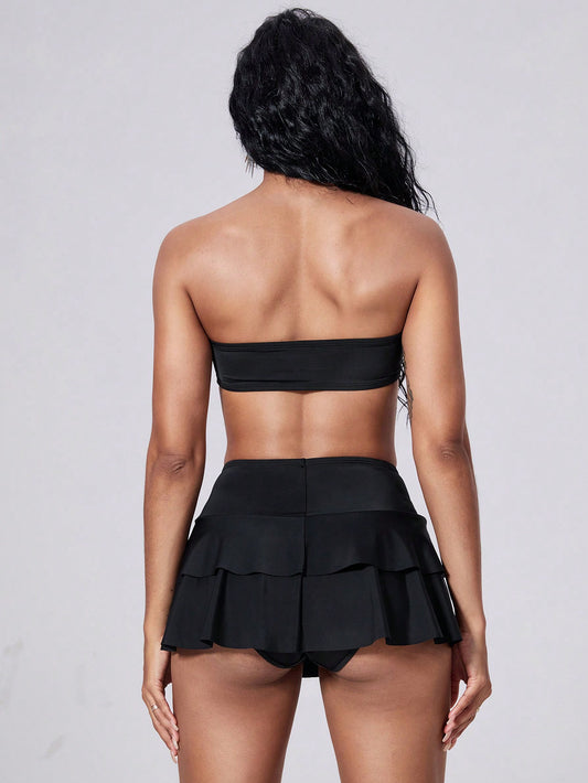 Punk Rivets Bandeau Two Piece Bikini Skirt Swimsuit