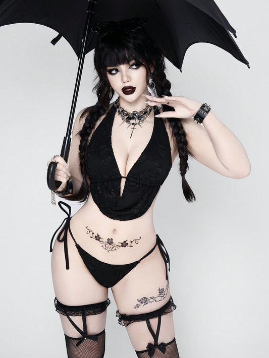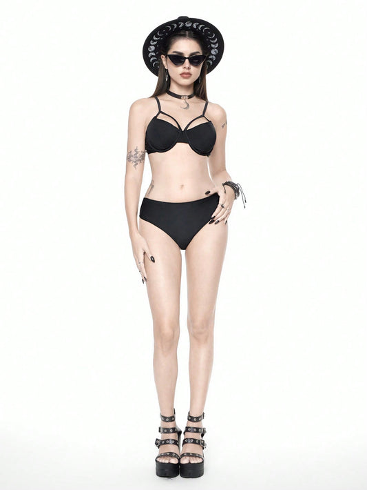 Alternative Goth Bowknot Lace Up Detail Split Two Piece Bikini Swimsuit