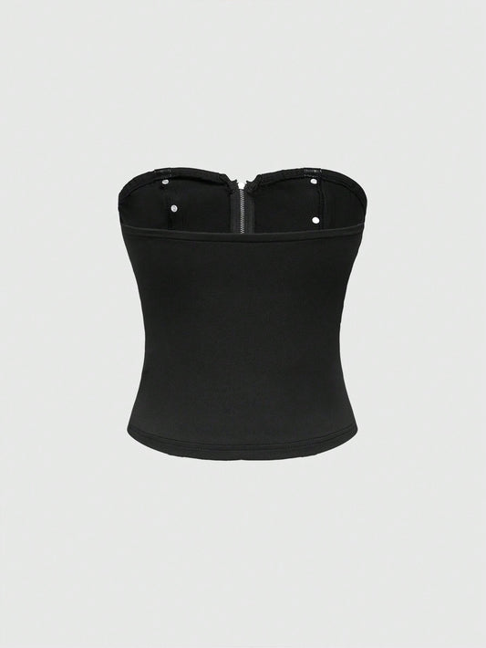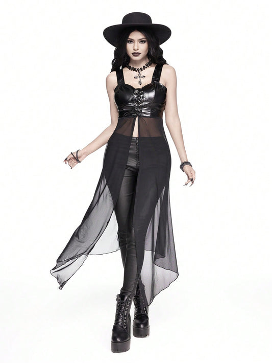 Witchy Mesh Contrast Asymmetric Hem Front Tie Corset Tops