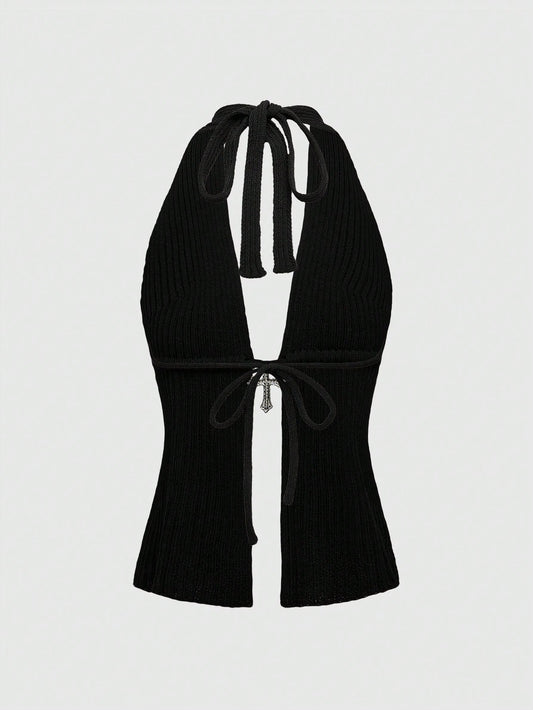 Alternative Black & White Striped Crystal Pendant Halter Neck Top