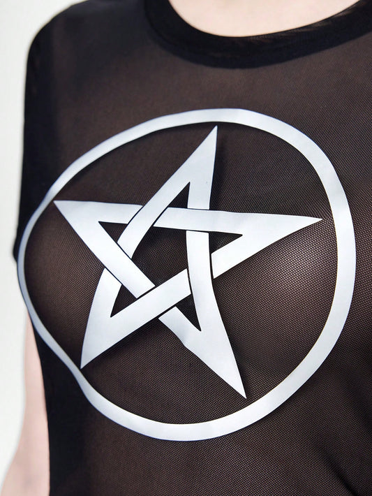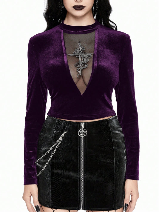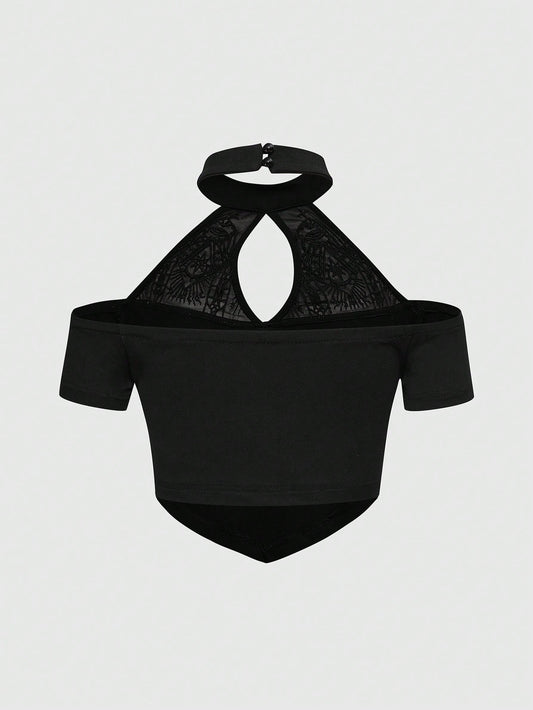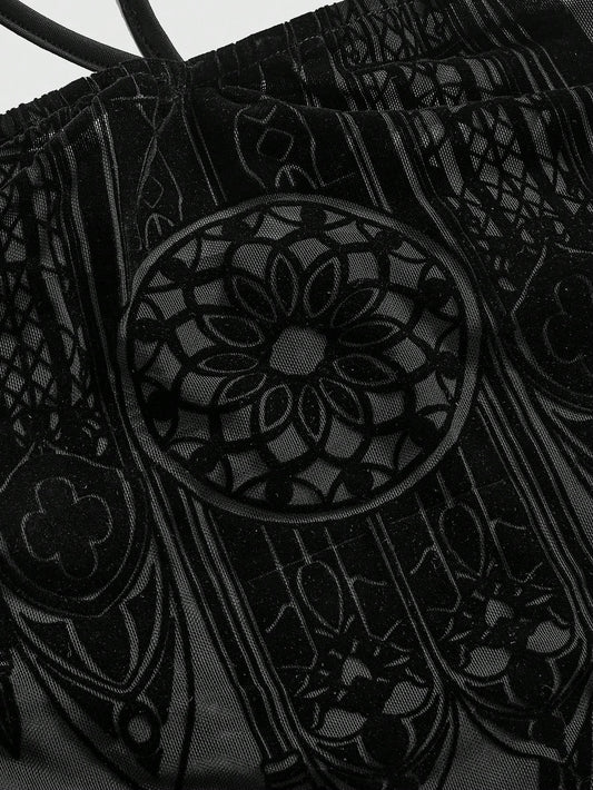 Gothic Cross Velvet Patchwork Semi-Sheer Mesh Flare Sleeve Halter T-Shirt