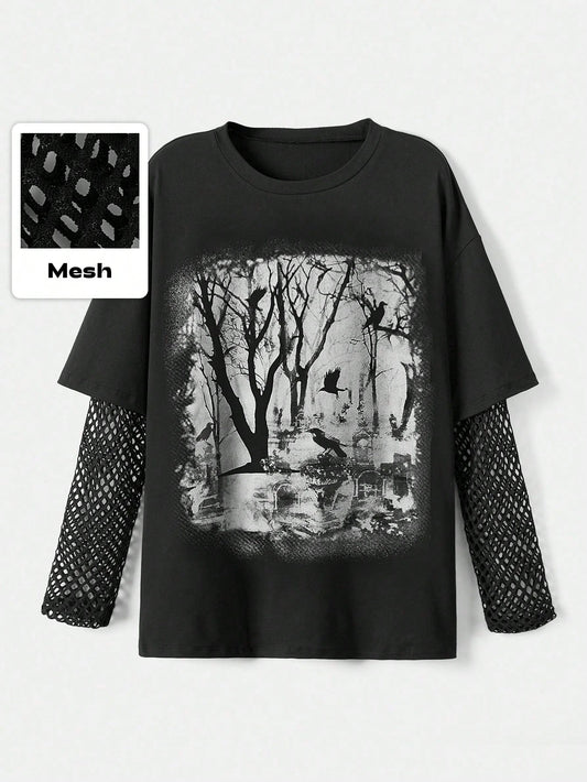 Gothic Forest Silhouette Printed Mesh Long Sleeve 2 In 1 T-Shirt
