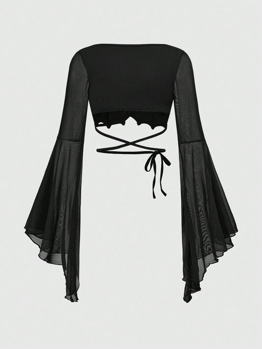 Bratty Batty Wing Mesh Sheer Flare Sleeve Cropped Top