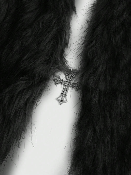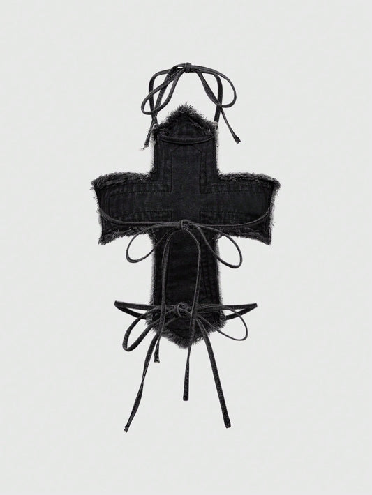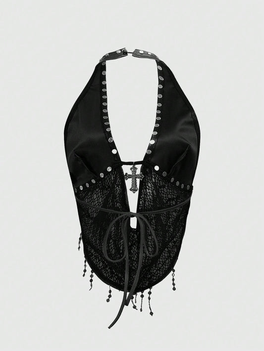 GrungeMetal Cross Pendant Mesh Sequins Splice Scoop Neck Backless Tank Top
