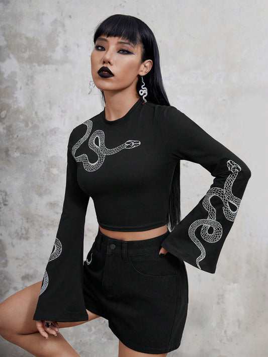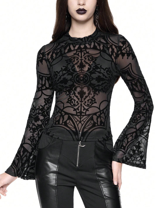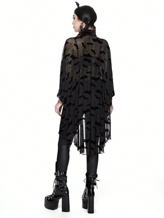 Gothic Bat Pattern Oversized Batwing Long Sleeve Sheer Blouse