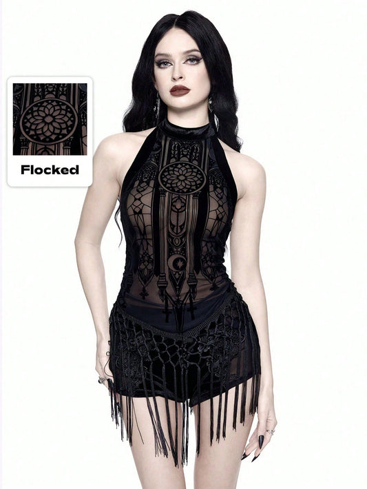 Gothic Cathedral Mesh Tassel Halter Tank Top