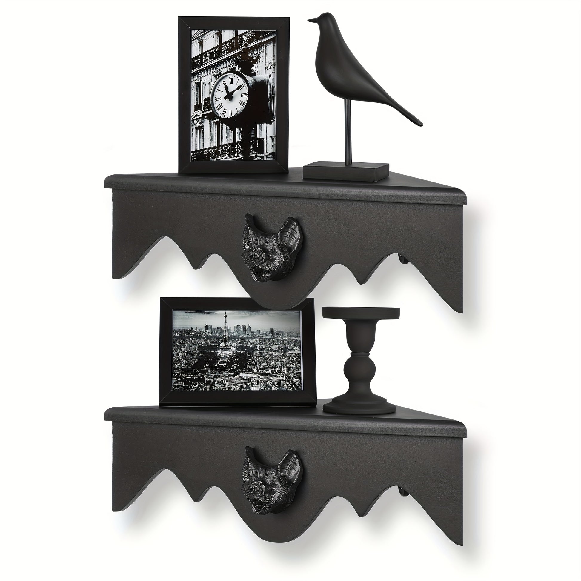 Unleash your inner goth with the Bat Corner Shelf Set of 2, perfect for those who dare to decorate outside the lines. These edgy shelves aren't just functional; they're a statement. Flaunt your most coveted curiosities and dark treasures in style, all while embracing your rebellious spirit.