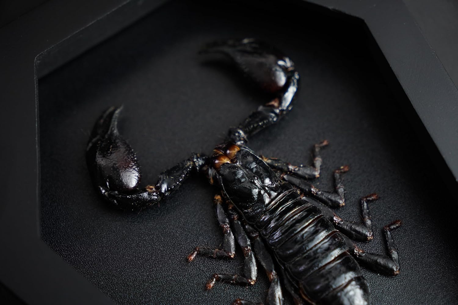 Step into the shadows with the Scorpion in Coffin Frame. This bold tribute to life's creepy crawlies and the darker corners of existence fuses gothic elegance with a rebellious spirit. Perfect for those who flirt with the unknown and thrive on the thrill of the eerie.